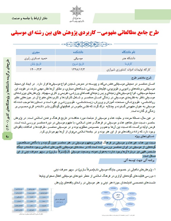 طرح جامع مطالعاتی مفهومی - کاربردی پژوهش های بین رشته ای موسیقی جناب آقای دکتر عسگری در کتاب طرحهای صنعتی برگزیده دانشگاهها و پژوهشگاههای کشور